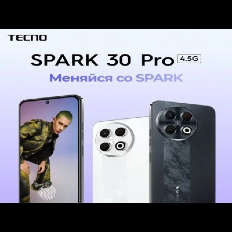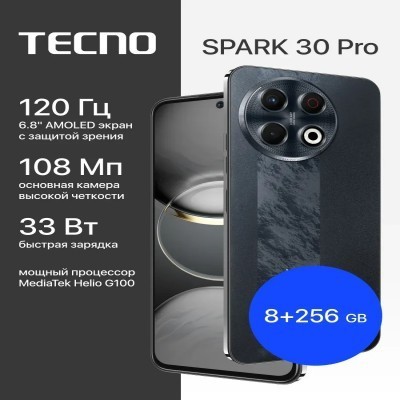 Меняйся со SPARK. Флагман серии надежных и сбалансированных смартфонов TECNO Spark 30 Pro создан для тех, кому важны продвинутые характеристики по доступной цене. Отличный компаньон для съемки и просмотра контента. Высокая производительность. Новый процессор MediaTek Helio G100 обеспечивает отличную производительность. Благодаря новому чипсету, поддерживается связь уровня 4.5G (LTE+, LTE Advanced). Смартфон обладает большим объёмом памяти 256 ГБ + 8 ГБ (+ расширение на 8 ГБ), что позволяет без труда сохранять все важные приложения, фото, видео и другие данные. Также есть слот для карты памяти microSD до 1 ТБ. Быстрая зарядка 33 Вт с лёгкостью пополнит энергию смартфона в короткие сроки, также можно выбрать режим скорости зарядки. Новый уровень просмотра контента. AMOLED FHD+ экран с частотой обновления 120 Гц обеспечивает практически бесконечную контрастность, глубокий чёрный цвет и плавную картинку. Пиковая яркость дисплея 1700 нит, точная цветопередача и сертификация экрана TÜV Rheinland обеспечивают комфортную работу без вреда для зрения. Благодаря двойным стереодинамикам звук получается в три раза громче и насыщеннее по сравнению с предыдущими моделями. Технология Dolby Atmos и поддержка Hi-Res Audio позволит вам полностью погрузиться в происходящее на экране. Снимайте чёткие и неповторимые фото даже ночью c основной камерой 108 Мп и светочувствительным сенсором размером 1/1.52”. Фронтальная камера 13 Мп с двойной вспышкой и возможностью настройки яркости и температуры, поможет запечатлеть каждую вашу эмоцию. Стильный и надёжный дизайн. TECNO Spark 30 Pro тоньше всех в новой серии Spark 30, и весит всего 188 грамм. Несмотря на внешнюю элегантность, смартфон можно использовать в различных ситуациях, даже если начался небольшой дождь. На экране есть олеофобное покрытие, поэтому смартфоном можно легко управлять даже мокрыми руками. Доступен в трёх цветах: Чёрный и Белый с пластиковой поверхностью, а также Зелёный с покрытием из экокожи Magic Skin 3.0.